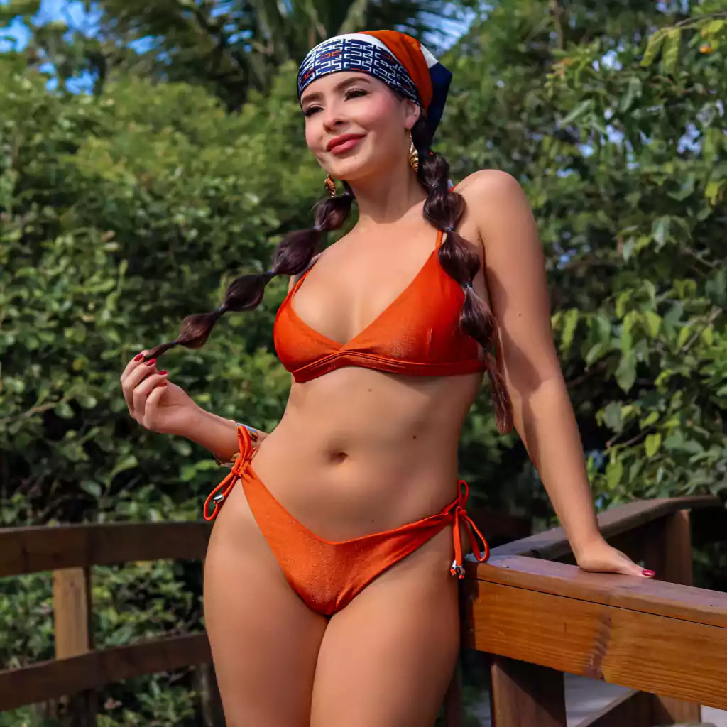 Apresentamos a nossa incrível calcinha de biquíni asa delta com amarração lateral Páprica Glow, a escolha perfeita para quem busca estilo, conforto e modernidade na moda praia verão 2025. Este design exclusivo combina o clássico corte asa delta — com cintura alta e cavas alongadas — à praticidade da amarração lateral, permitindo um ajuste personalizado e um toque de charme extra.