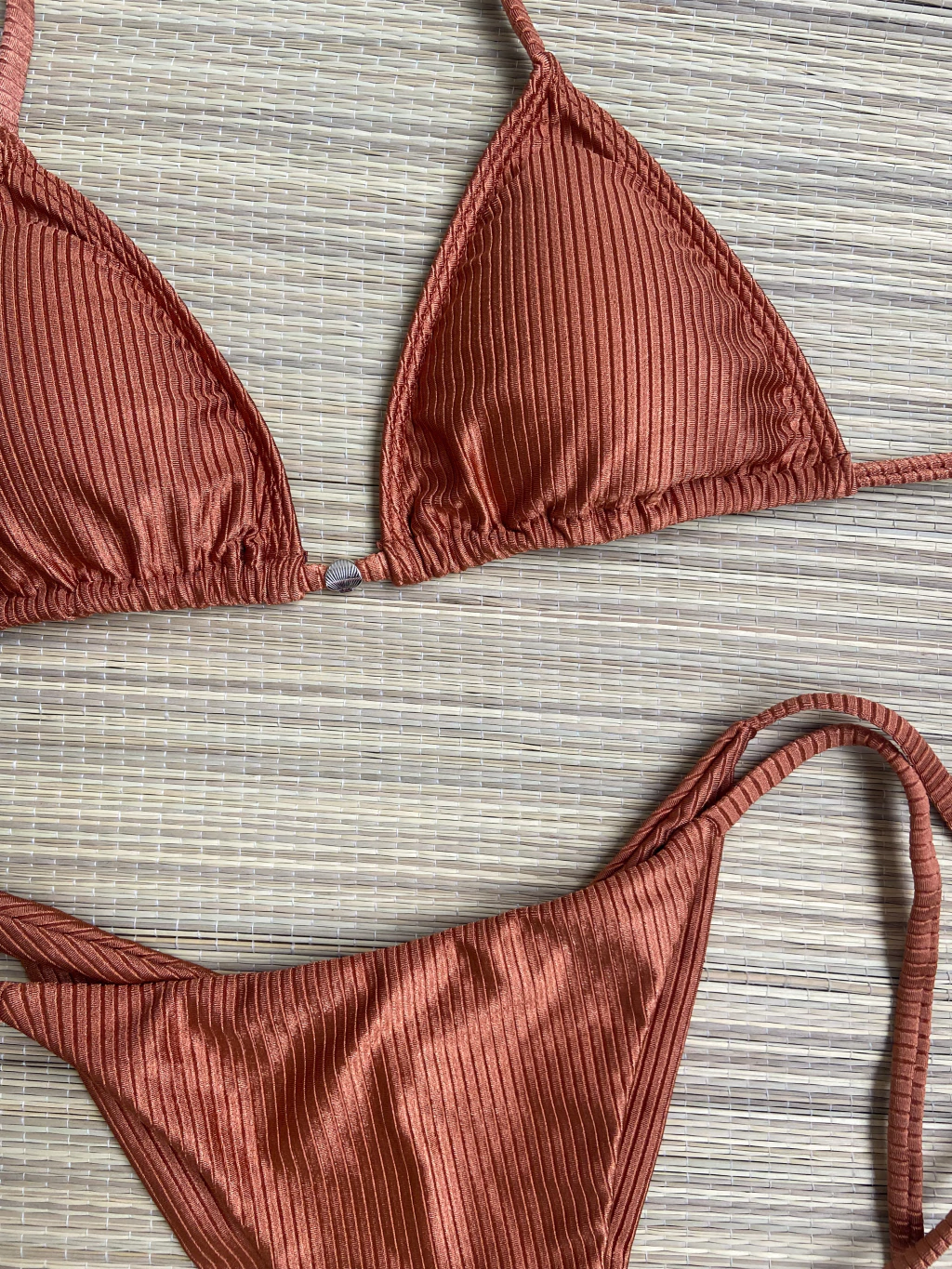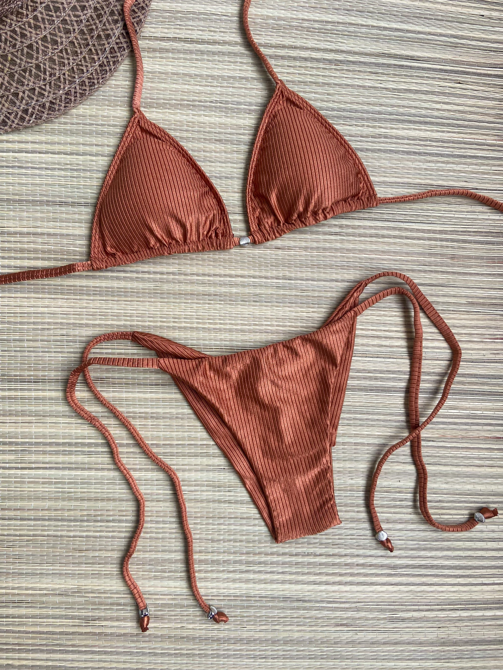 A cor marrom avelã, um tom terroso sofisticado e moderno, realça seu bronzeado e combina facilmente com diversos tops, como o top cortininha, o top com argola ou o top fixo da mesma coleção, proporcionando inúmeras possibilidades de looks para o seu verão.