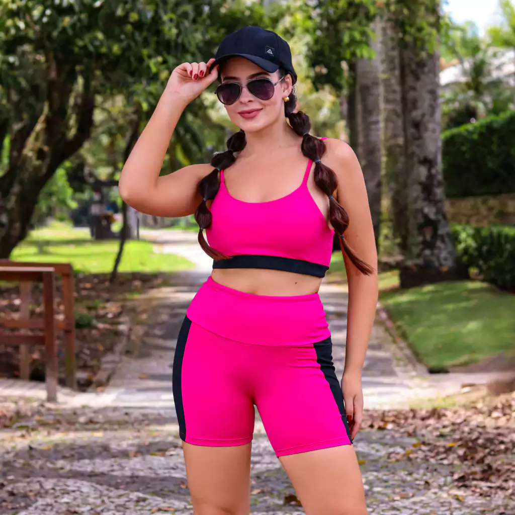 Shorts Fitness c/ Bolso - Pink Destaque seu treino com o Shorts Fitness com Bolso na vibrante cor pink, perfeito para quem busca aliar conforto, estilo e alta performance. Seu design moderno, com recortes em preto, traz uma atitude esportiva e sofisticada para qualquer atividade física.
