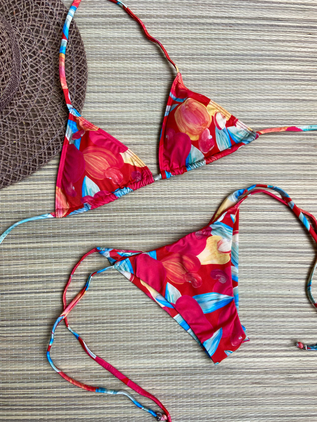 Sua estampa vibrante em tons de vermelho e laranja, com desenhos delicados de caju, traz um toque tropical e exclusivo para o seu visual de praia ou piscina.