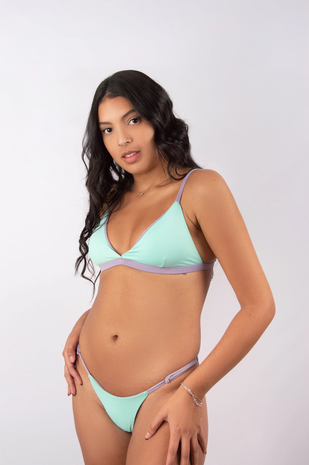 Ideal para quem busca um biquíni que una estilo e funcionalidade, ele conta com bojo removível e uma modelagem que oferece suporte com leveza. A combinação de tons suaves em menta e lilás confere um toque moderno, feminino e sofisticado ao seu visual de praia ou piscina.