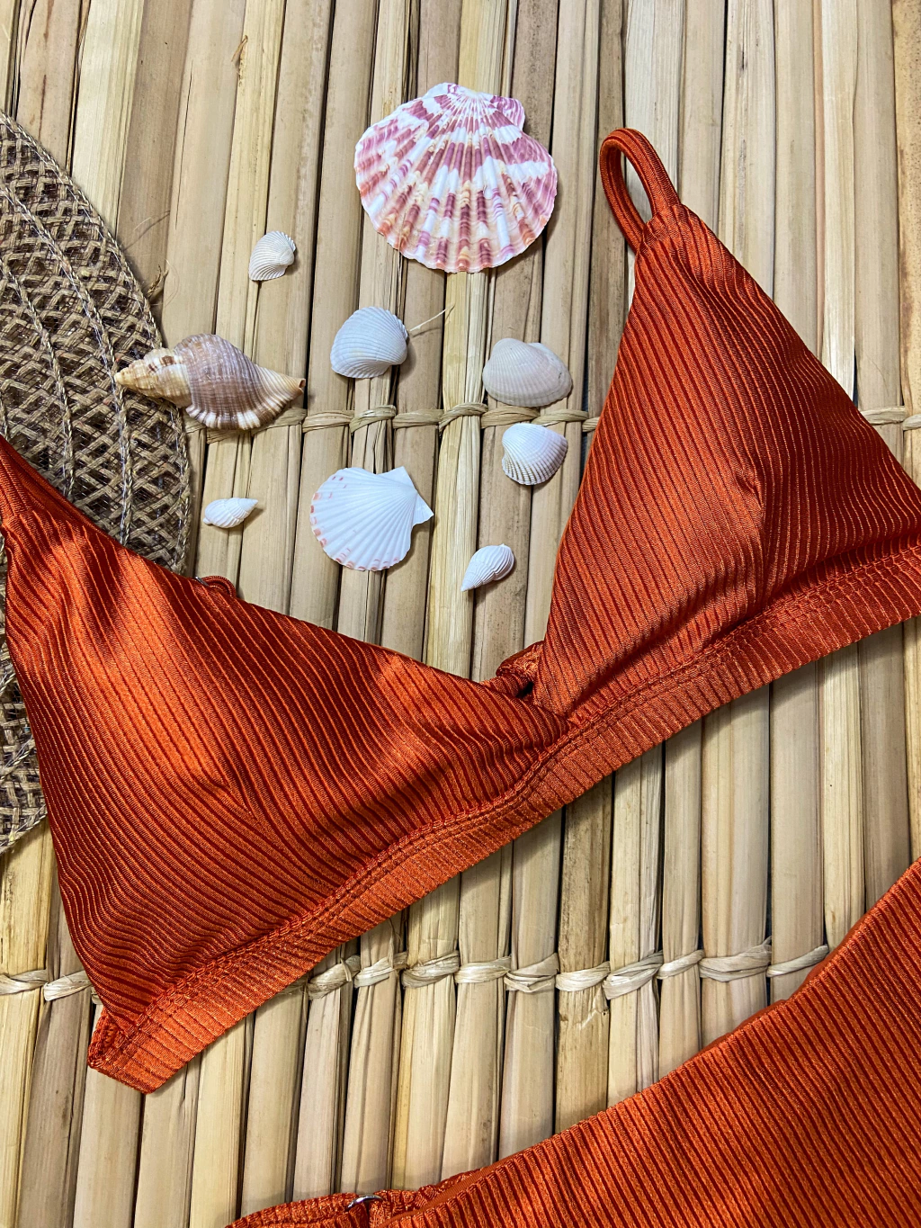 Este top de biquíni fixo na cor páprica, com textura canelada e proteção UV50+, é ideal para quem busca versatilidade e charme no visual de praia. O modelo possui alças reguláveis, que podem ser usadas nos ombros ou amarradas no pescoço, se adaptando ao seu estilo e garantindo melhor sustentação.
