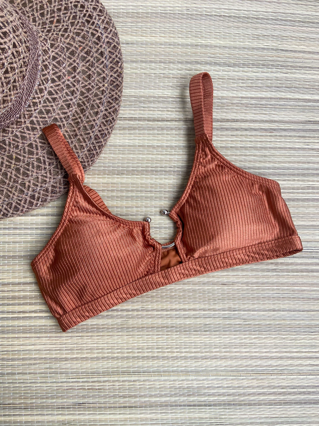 Descubra o top de biquíni perfeito para quem busca sustentação, conforto e estilo em um só produto. Com a charmosa cor marrom avelã e acabamento canelado, este top traz um design clássico de triângulo, enriquecido com uma argola central que adiciona um toque de sofisticação único.