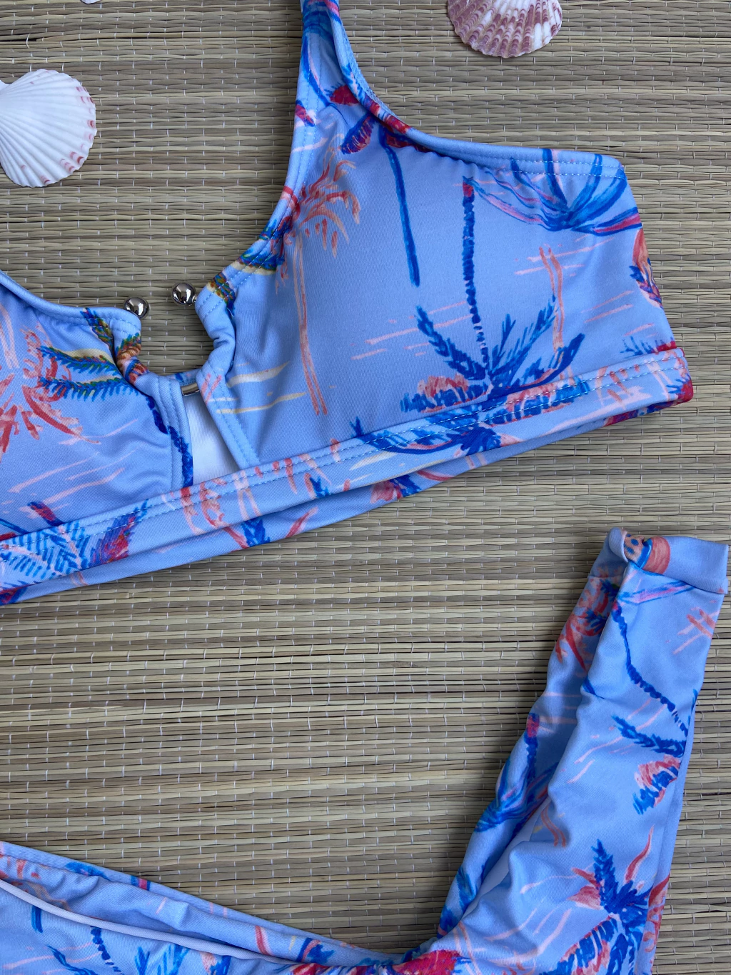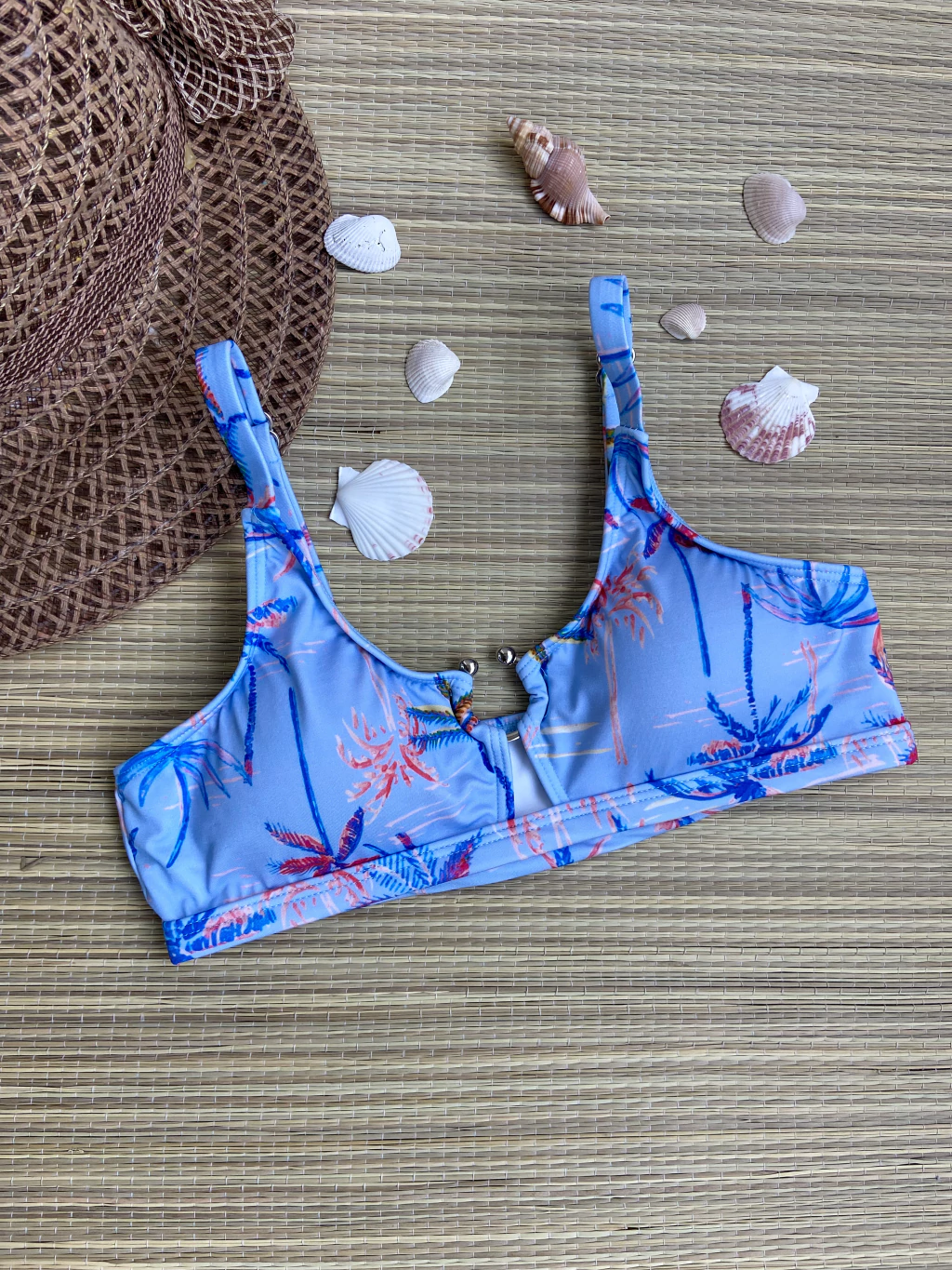 Descubra o Top de Biquíni Triângulo com Argola na encantadora estampa de coqueiro sobre fundo azul, a escolha ideal para quem busca conforto e sofisticação. Este biquíni combina um design clássico de triângulo com um detalhe elegante da argola central, elevando seu estilo à beira-mar.